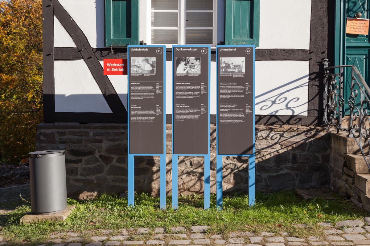 Auf dem rund 42 Hektar großen Gelände mit etwa 60 historischen Gebäuden und Werkstätten kommen unterschiedliche Informationsträger zum Einsatz. Großformatige Lagepläne, Objekt- und Gebäudestelen vermitteln detaillierte Inhalte zu Orten und Exponaten, während markante Sternwegweiser die Besucher:innen bei der Orientierung auf dem weitläufigen Gelände unterstützen.