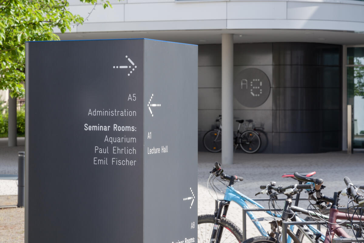 Im Gebäudeinneren kommen überwiegend wandmontierte Schilder zum Einsatz, während im Außenraum freistehende Stelen die Orientierung auf dem Campus übernehmen. Besondere Bereiche wie Seminarräume werden durch Schriftzüge aus Einzelbuchstaben räumlich hervorgehoben.