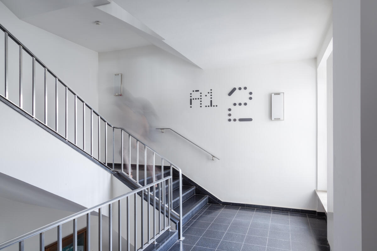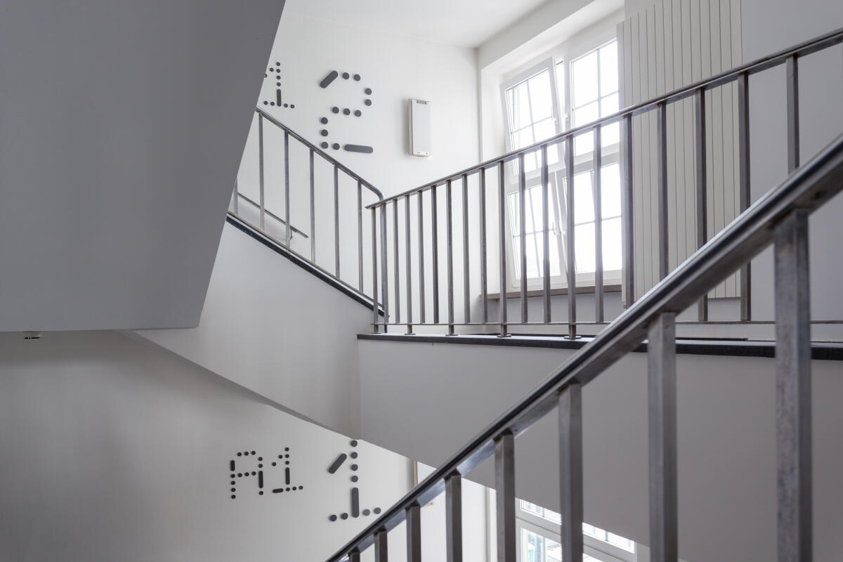 Ergänzend dazu wurde eine eigens für das HKI entwickelte Displayschrift gestaltet. Sie greift diese Formsprache auf und wird insbesondere für Gebäude- und Geschosskennzeichnungen sowie Richtungsangaben eingesetzt. So erhält das Leitsystem einen eigenständigen, unverwechselbaren Charakter.